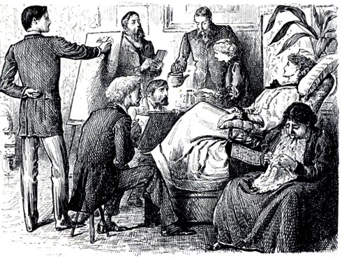 Two of du Maurier's illustration for Trilby (1894). Left: "The Soft Eyes." Right: "A Throne in Bohemia." [Click on these images to enlarge them, and for more information about them.]