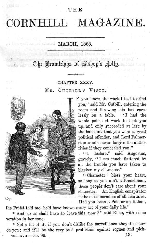 Lever, Charles. The Bramleighs of Bishop’s Folly. The Cornhill Magazine 15 (June, 1867): pp. 640-664; 16 (July-December 1867): 1-666; 17 (January-June 1868): 70-663; 18 (July-October 1868): 1-403. Rpt. London: Chapman & Hall, 1872. Illustrated by M. E. Edwards; engraved by Joseph Swain.