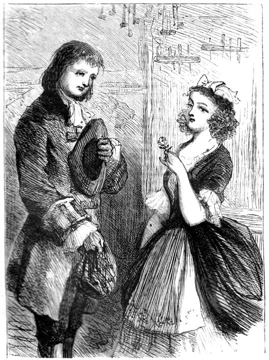 In this sixth full-page illustration, Eytinge provides a dual character study of the romantic leads. Here, a diffident Joe Willet bids a reluctant farewell to the village beauty, Dolly Varden, in chapter 31. [Commentary continues below.]