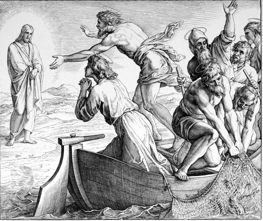 The resurrected savior appears to his disciples at the Sea of Galilee. Artist: Julius Schnorr von Carolsfeld. Engraver: Joch, inscribed lower left. Source: Die Bibel in Bildern, Plate 224. Click on image to enlarge it.