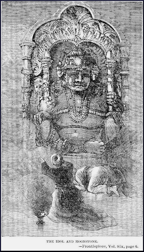 The frontispiece (1900) is based on the very first illustration in the 1868 serialisation Harper's Weekly: A Journal of Civilisation, the 4 January 1868 uncaptioned headnote vignette depicting a much earlier set of Brahmin priests worshipping the Hindu Moon God at his shrine in Benares, the gigantic diamond apparently glowing with its own light in the centre or "third eye" of the statue's forehead. The illustration does not give the viewer a sense of the deity's statue being in the confined space of a Hindu temple. Rather, the American illustrator enshrouds the statue in the voluminous smoke of the incense-burner (lower left), so that the idol and its devotees exist outside conventional space, in an otherworldly or unworldly circumstance that is soon to be violated by foreign conquerers of an entirely different religious faith (in the first instance, the Islamic invaders of India). Thus, the former headnote vignette converted to a frontispiece entitled The Idol and the Moonstone makes manifest Collins's issues of imperial conquest and the timeless devotion of the priests, which parallels the other "romance" of the story, that of Franklin Blake and Rachel Verinder. Wood-engraving, 12.7 cm high by 7.6 cm wide (5 by 3 inches). This is evidence of Harper's having the original serial illustrations re-drafted for volume publication as the original (4 January 1868) vignette was 11.3 cm by 5.5 cm (4 ½ by 3 ¼ inches), and would not have been sufficiently large for a full-page frontispiece. [Click these images to enlarge them.]