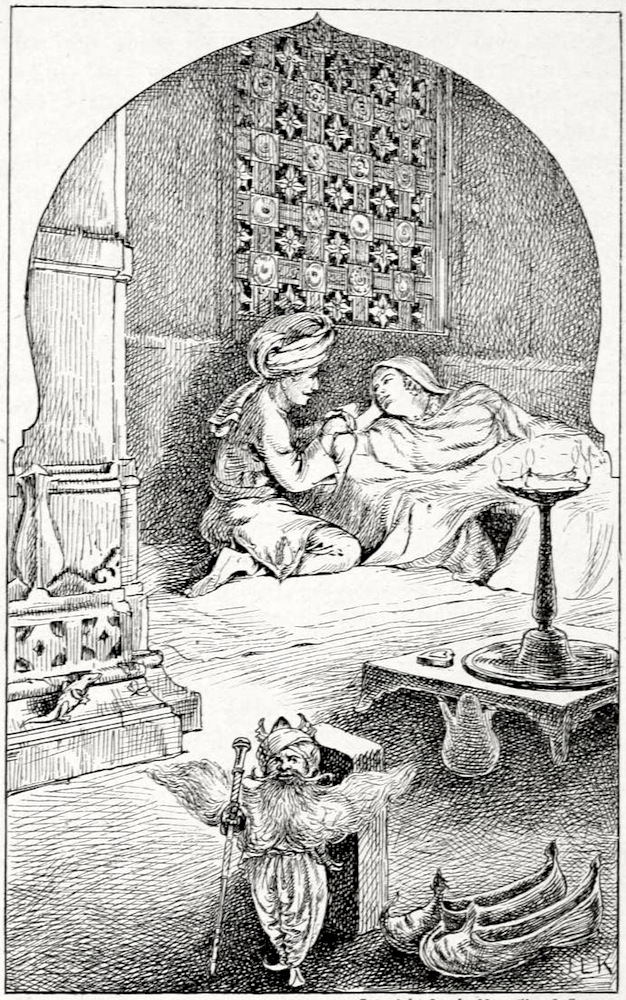 Illustrating this collection of Indian folk tales for children, perhaps "the most attractive and unified of all his conventionally illustrated books" (James 373), was one of Kipling's projects after returning to England. In the opening tale, a lowly soldier's son falls in love with Princess Blossom, and all ends happily with the help of his diminutive servant Sir Buzz — a sort of genii, shown in the foreground. The details in the illustration, such as the intricately carved screen and elegant furniture, the soldier's worn shoes, and even the tiny gekko on the ledge to the left, add hugely to its charm.