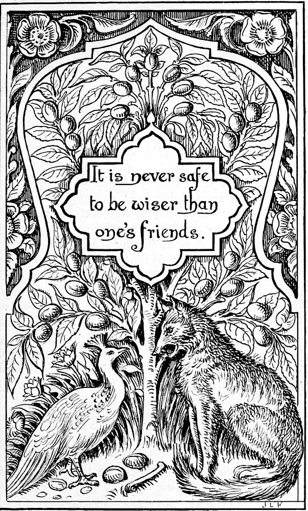 Illustration for "The Jackal and the Pea-hen" in Tales of the Punjab: Told by the People, facing p.196.