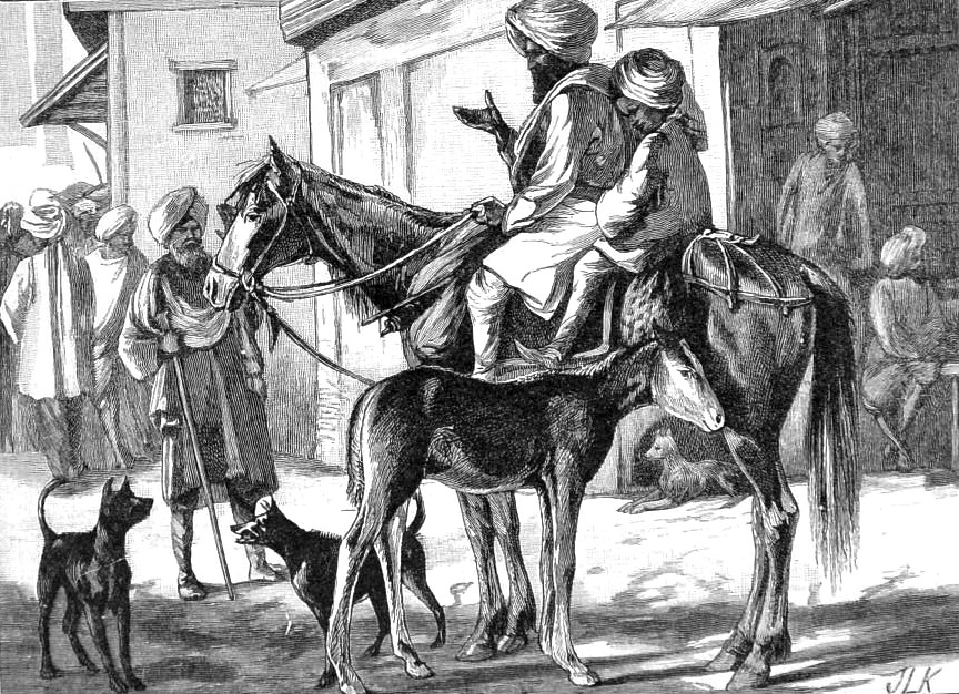 Punjabi Farmer on a Branded Mare, by John Lockwood Kipling (1837-1911). This is another of the illustrations for Chapter VIII, "Of Horses and Mules," in Beast and Man in India (1891), facing p. 209. Rather amusingly, Kipling reports that horses imported from cold countries needed caps in India to prevent them from having sunstroke or headaches (he illustrates this as well), but indigenous breeds were better acclimatised. This full-page illustration shows the typical farmer's steed, rather ill-kempt but not particularly skinny and not deprived of her foal. "Branded" reminds us of the comment: