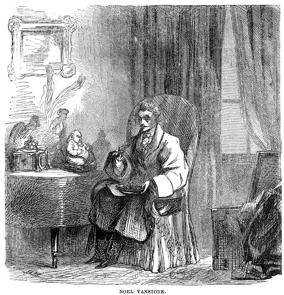 Magdalen found herself in a long, narrow room, consisting of a back parlor and a front parlor, which had been thrown into one by opening the folding-doors between them. Seated not far from the front window, with his back to the light, she saw a frail, flaxen-haired, self-satisfied little man, clothed in a fair white dressing-gown many sizes too large for him, with a nosegay of violets drawn neatly through the button-hole over his breast. He looked from thirty to five-and-thirty years old. His complexion was as delicate as a young girl’s, his eyes were of the lightest blue, his upper lip was adorned by a weak little white mustache, waxed and twisted at either end into a thin spiral curl. When any object specially attracted his attention he half closed his eyelids to look at it. When he smiled, the skin at his temples crumpled itself up into a nest of wicked little wrinkles. He had a plate of strawberries on his lap, with a napkin under them to preserve the purity of his white dressing-gown. At his right hand stood a large round table, covered with a collection of foreign curiosities, which seemed to have been brought together from the four quarters of the globe. Stuffed birds from Africa, porcelain monsters from China, silver ornaments and utensils from India and Peru, mosaic work from Italy, and bronzes from France, were all heaped together pell-mell with the coarse deal boxes and dingy leather cases which served to pack them for traveling. The little man apologized, with a cheerful and simpering conceit, for his litter of curiosities, his dressing-gown, and his delicate health; and, waving his hand toward a chair, placed his attention, with pragmatical politeness, at the visitor’s disposal. Magdalen looked at him with a momentary doubt whether Mrs. Lecount had not deceived her. Was this the man who mercilessly followed the path on which his merciless father had walked before him? She could hardly believe it. “Take a seat, Miss Garth,” he repeated, observing her hesitation, and announcing his own name in a high, thin, fretfully-consequential voice: “I am Mr. Noel Vanstone. You wished to see me — here I am!” [Chapter III: page 445 in serial; pp. 113-114 in volume]