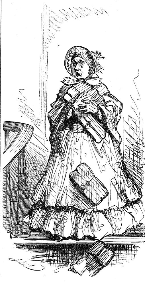 Although the comic study of personified ineptitude in the vignette speaks for itself, the context again reinforces the reader's appreciation of the girl's competency. She must convince the addle-headed woman that she saw nothing when, in fact, Mrs. Wragge had seen Magdalen disguised as Mrs. Garth. That surprise may well have caused Mrs. Wragge to drop her parcels.