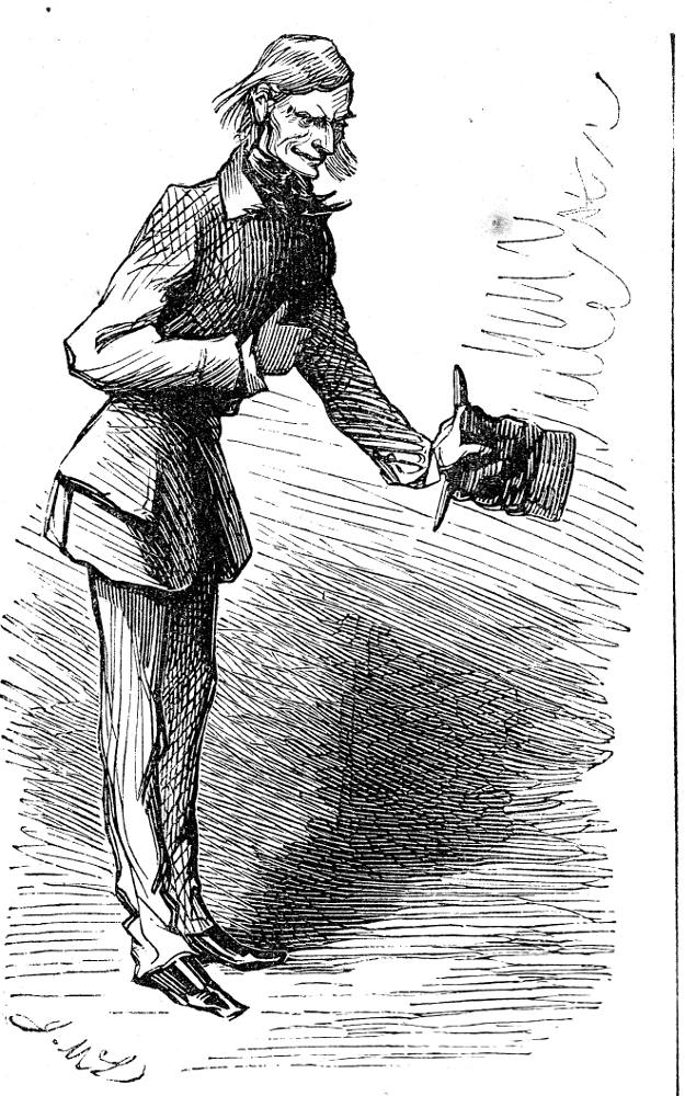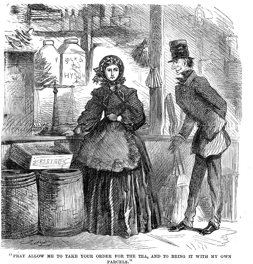 “Pray allow me to take your order for the tea, and to bring it with my own parcels.” Wood-engraving 11.6 cm high by 11.5 cm wide, or 4 ½ inches square, framed, for instalment twenty in the American serialisation of Wilkie Collins’s No Name in Harper’s Weekly [Vol. VI. — No. 291] Number 21, “Between the Scenes. XII. From Captain Wragge to Magdalen. North Shingles Villa. Aldborough, Suffolk, July 22” (page 477; p. 130 in volume), plus an uncaptioned vignettte of Captain Wragge, bowing (II. “From Captain Wragge to Magdalen. Birmingham, July 2, 1847” (page 477; p. 125 in volume): 11 cm high by 5.6 cm wide, or 4 ¼ inches high by 2 ¼ inches wide, vignetted. [Instalment No. 20 ends in the American serialisation on page 479, at the end of “The Third Scene, XIII.” Precisely the same number without illustration ran on 26 July 1862 in All the Year Round.]