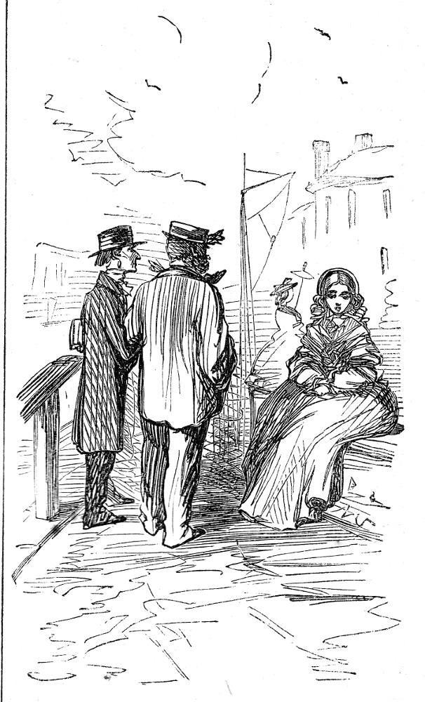 In the uncaptioned vignette (lower left on the serial page), we see Magdalen, but recently arrived from London by the Eastern Counties Railway, sitting on the wall outside the North Shingles Villa. She is somewhat upset by the two strangers who have been scrutinizing her as she sits, waiting for Wragge to return to the pathway after locking his wife (who must now assume the name “Julia Bygrave”) into her room: they cannot afford to have Mrs. Wragge wandering about the village until she has mastered her new name and identity. Quite by accident, Magdalen attracts the interest of two local passersby, Rev. Strickland and his brother-in-law merchant Captain Kirke, who will prove an important addition to the cast of characters.