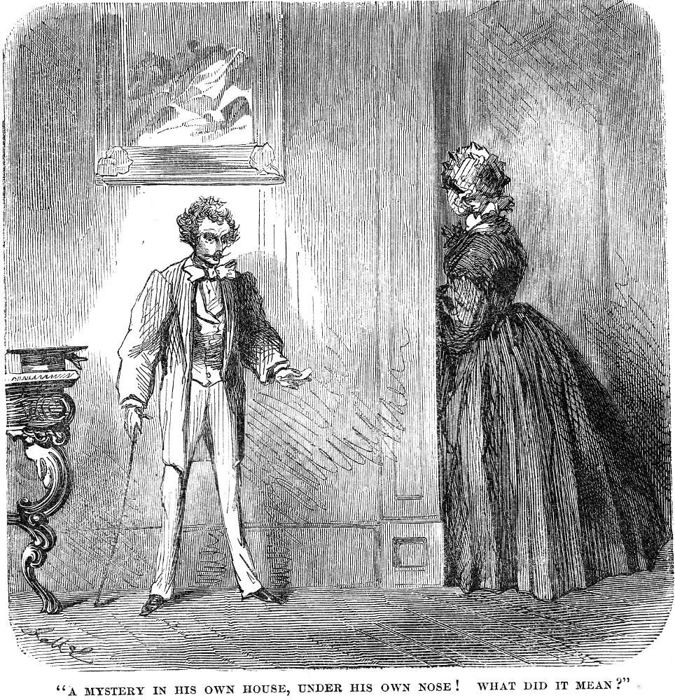 Noel Vanstone looked from the folded paper to the door, and from the door back to the folded paper, in unutterable astonishment. A mystery in his own house! under his own nose! What did it mean? [“The Fourth Scene — Aldborough, Suffolk.” Chapter VI: in the American serialisation, p. 555; p. 159 in volume]