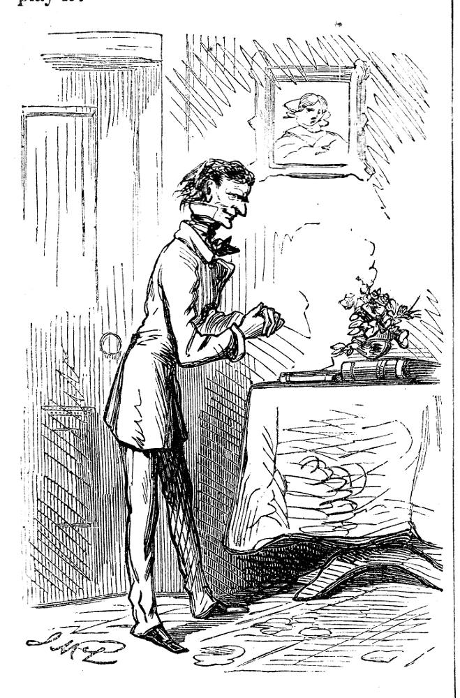 As Mrs. Lecount flounces out of the room (right), her stunned employer stares at the folded note that she has just given him: he, like the reader, wonders what it contains. Collins does not make the reader wait long: “The folded paper contained nothing less than a carefully written extract from the personal description of Magdalen in Miss Garth’s letter.” Thus, at the very curtain of the twenty-fifth instalment, Mrs. Lecount seems to have exposed the conspiracy against her master. But will the stunned Noel Vanstone, now very much in love with Magdalen (“Susan Bygrave”) credit the note?