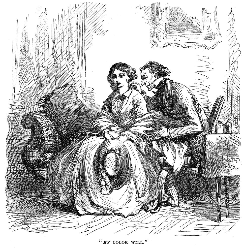 “My colour will.” Wood-engraving 11.6 cm high by 11.5 cm wide, or 4 ½ inches square, framed, for instalment twenty-six in the American serialisation of Wilkie Collins’s No Name in Harper’s Weekly [Vol. VI. — No. 294] Number 26, “The Fourth Scene — Aldborough, Suffolk.” Chapter VII (page 573; p. 162 in volume), plus an uncaptioned vignettte of Captain Wragge, hiding behind a fishing vessel (p. 573; p. 165 in volume): 11 cm high by 5.6 cm wide, or 4 ¼ inches high by 2 ¼ inches wide, vignetted. [Instalment No. 26 ends in the American serialisation on page 575, at the end of Chapter VII. Precisely the same number without illustration ran on 6 September 1862 in All the Year Round.]