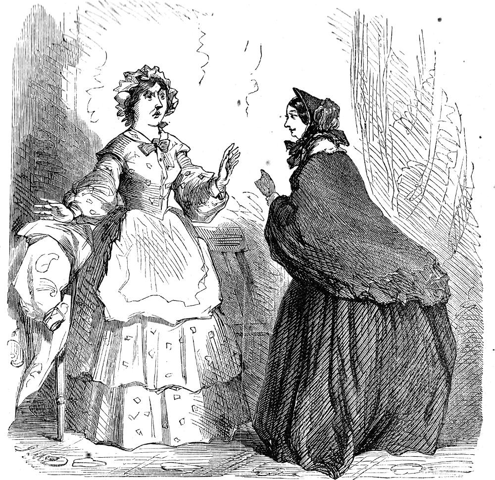 Determined to unmask “Susan Bygrave” as the woman who visited her employer at Vauxhall Walk in London disguised as Miss Garth, Mrs. Lecount intends to verify the one piece of evidence that she came away with: a fragment of the spurious Miss Garth’s Alpaca gown, from which the crafty housekeeper had surreptitiously clipped a fragment. Although readers know that Magdalen has since sold off her theatrical costumes and properties, readers do not know whether she has retained that particular gown in her wardrobe. When first thing that morning Captain Wragge departs for an hour’s sea-bathing in a boat and then Magdalen hurriedly exits the villa to take a walk on the marine parade, the vigilant Mrs. Lecount sees her chance to enter The North Shingles Villa by stealth, slip past any servants and the mentally incompetent Mrs. Wragge, and thoroughly inspect the wardrobe of the future “Mrs. Noel Vanstone.” Unfortunately, the cunning housekeeper now encounters the Captain’s wife. But Mrs. Lecount handles her so well that she at last obtains her objective, and sees the Alpaca dress hanging in the girl’s wardrobe. Although she cannot inspect it, Mrs. Lecount has ascertained through various slips that her interlocutor has made that “Susan Bygrave” is in fact Magdalen Vanstone, and that her neighbours at Aldborough were in fact in residence at Vauxhall Walk.