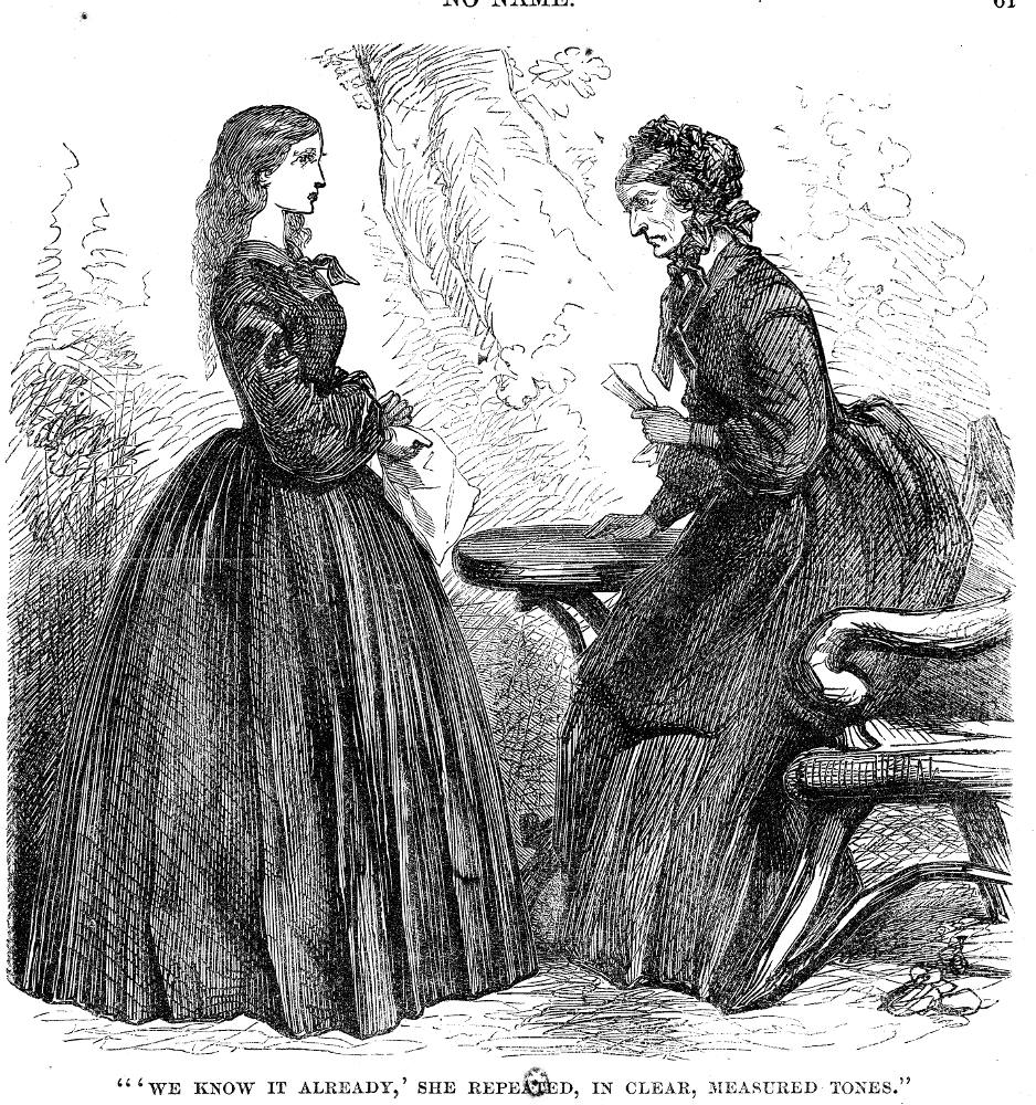 Main plate “We know it already,” she repeated, in clear, measured tones. — and the accompanying headnote vignette for "The First Scene," Chapter XIII (continued) and XIV in Wilkie Collins's No Name, first published in All the Year Round and Harper's Weekly (Vol. VI-No. 279), the 10 May 1862 instalment; vignette: 11.7 cm high by 5.5 cm wide, or 4 ⅝ inches high by 2 ¼ inches wide, vignetted; with the smaller and regular illustrations both appearing on p. 301 in the serial). The main plate, also a wood-engraving, appears at the bottom of the folio page in the serial: 11.5 cm high by 11.5 cm wide, or 4 ½ inches square, framed (bottom of p. 61 in volume's Chapter XIV).