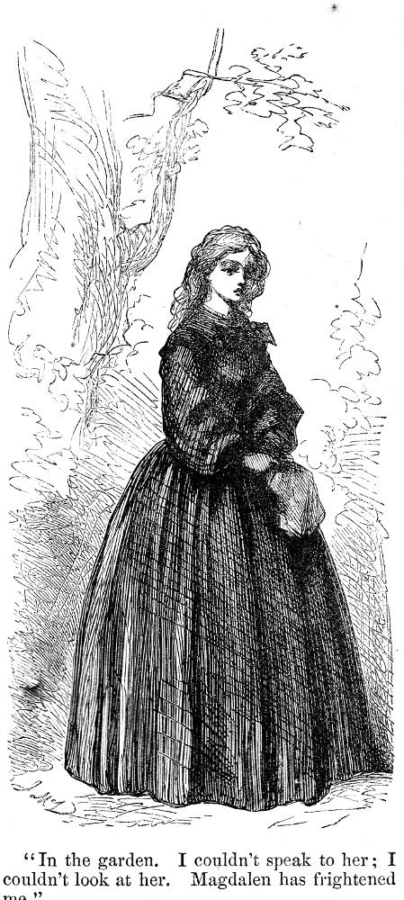 “In the garden. I couldn’t speak to her; I couldn’t look at her. Magdalen has frightened me.” [p. 302 in serial, p. 62 in volume]