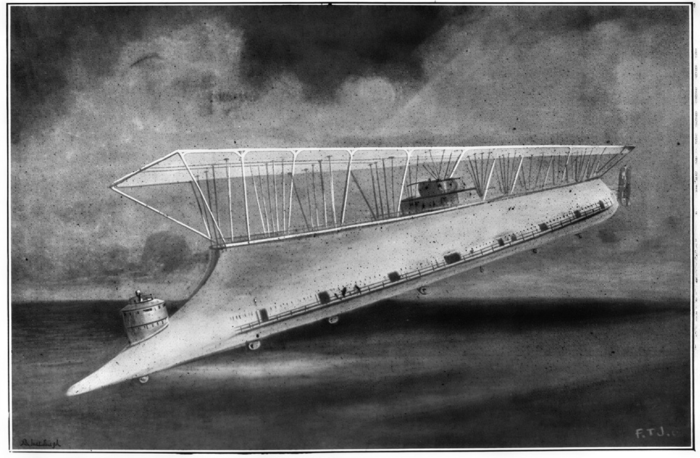 Technological wonders. Left: Fred T. Jane’s airship in Hartmann the Anarchist. Middle: Another view of the wondrous ship. Right: Stanley Wood’s spaceship in ‘Stories of Other World’.