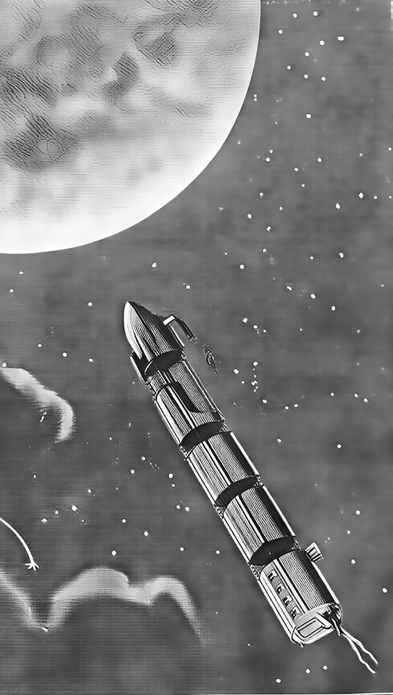 Glimpses of the future. Left: Montaut’s space-craft/projectile which is shot at the Moon (as in the film by Méliès). Right: The space craft in parts, a detail that curiously prefigures the rocket’s division into parts in the Apollo moon shots.