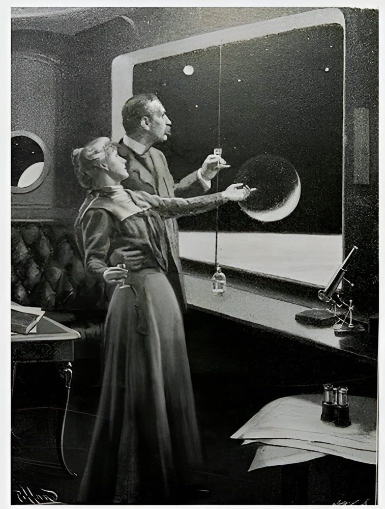The notion of the sanctuary-craft also informs the illustrations for Griffith’s ‘Stories from Other Worlds,’ later retitled A Honeymoon in Space (1900). The frontispiece for the book version by Harold H. Piffard shows the newly-weds Zaidie and Redgrave looking out of a window at the cosmos – but the interior, with its elegant padded furniture and table-telescope, could easily be a comfortable lounge in a metropolitan apartment.