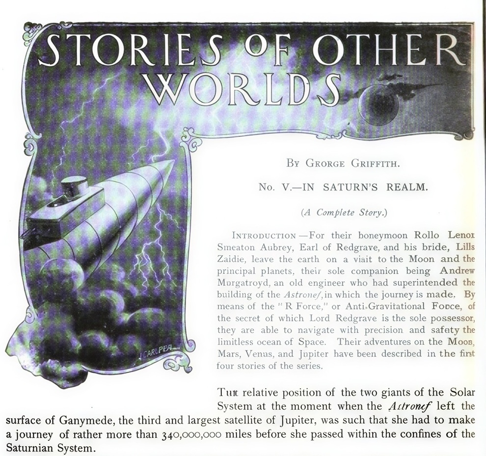 Griffith, George Chetwynd. ‘Stories from Other Worlds.’ Illustrated by Stanley L. Wood. Pearson’s Magazine 9–10 (Jan–Jul 1900). Reissued in a revised and extended form as A Honeymoon in Space. London: Pearson, 1900.