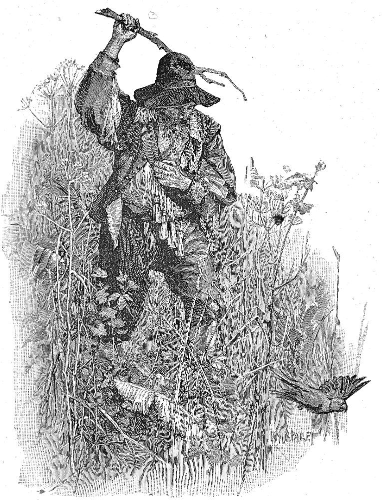 With these considerations, I walked very leisurely forward. I found that side of the island where I now was much pleasanter than mine — the open or savannah fields sweet, adorned with flowers and grass, and full of very fine woods. I saw abundance of parrots, and fain I would have caught one, if possible, to have kept it to be tame, and taught it to speak to me. I did, after some painstaking, catch a young parrot, for I knocked it down with a stick, and having recovered it, I brought it home; but it was some years before I could make him speak; however, at last I taught him to call me by name very familiarly. But the accident that followed, though it be a trifle, will be very diverting in its place. [Chapter VIII, "Surveys His Position," page 79]