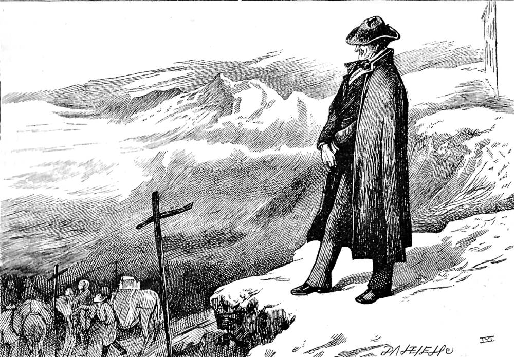 James Mahoney's 1873 composite wood-engraving for Book 2, Chapter 3, in which Rigaud stalks the English travellers from a distance as they descend from the Great Saint Barnard, Always standing on one jutting point looking down after them. [Click on the image to enlarge it.]