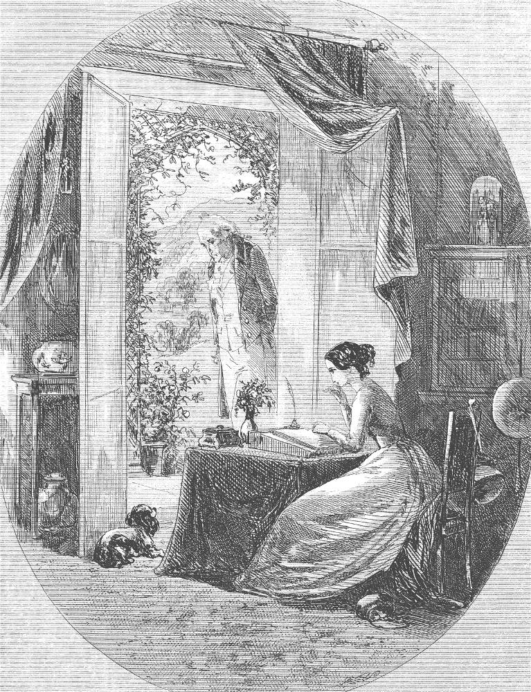 The job of the illustrator, then, is to contrast in every way the slovenly residence of the caretaker with the idyllic, picturesquely ordered and thoroughly pleasing cottage leased by Cornelius Corrigan, retired royal guardsman, and his beautiful, fashionably dressed grand-daughter. Everything about the garden glimpsed through the open doorway and the comfortable parlour suggests a respectable lifestyle: a fishbowl, a spaniel, a writing desk, a fire-screen, and a full case of books suggests the class, education, and refinement of the congenial leasees.