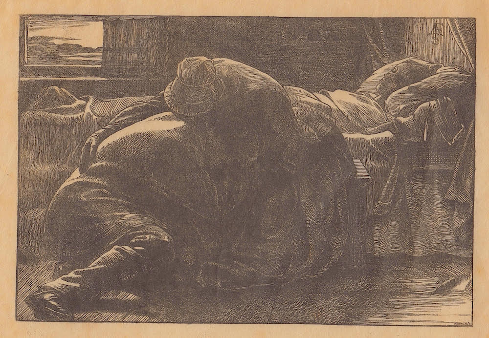 An illustration for a poem by Marian James, this image embodies a recurrent motif in Victorian culture – the figure of the lover who turns up too late, arriving once his beloved has passed away. This notion features on several occasions in the poetry of Christina and Dante Gabriel Rossetti, and W. Holman Hunt's The Pilgrim's Return depicts the same subject. The treatment by Sandys displays the usual psychological intensity, enhancing a type of scene that features throughout book illustration of the 1860s.