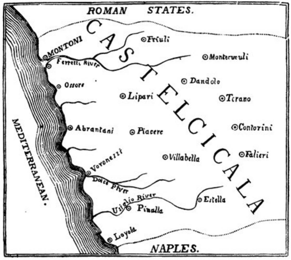 The Grand-Duchy of Castelcicala is bounded on the north by the Roman States, on the south by the kingdom of Naples, on the east by the Apennine Mountains, and on the west by the Mediterranean Sea.