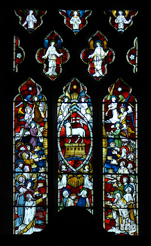 The East Window of St Andrew's, Weaverthorpe, Yorkshire, by Clayton and Bell (see listing text), possibly designed by George Edmund Street. This three-light window, on the theme of the "Adoration of the Lamb," was probably installed during Street's restoration of the old Norman church in 1870-72. The panel on the right shows the great amount of detail in the robes of the richly dressed kings, who hold out their glistening crowns in token of the yielding of all earthly power. Above them are musician angels giving praise.
