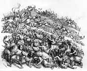 Next, they head to see the White Horse itself, which men employed by the local squire, "a person in yellow leather gaiters" (38), busily clean. While Joe and the squire are deep in conversation, Dick encounters "a very grave, elderly man" (43), an antiquarian steeped in local lore, who tells him, among many other things, that the proper name of Dragon's Hill is actually Pendragon's Hill, for it refers to one of several King Arthurs, "one of whom was probably slain in battle and buried here" (46). The old man then tells him about the great Battle of Ashdown in 871 in which Alfred led the Christian English to defeat the pagan Danish invaders, who had earlier slain King Edmund, after his brother King Æthelred is killed. "This year, A. D. 871, is a year for Berkshire men to be proud of, for on them fell the brunt of that fiery trial; and their gallant stand probably saved England a hundred years of Paganism" (72). His companion then turns to the White Horse, informing him that "it is a copy of the Saxon standard" (75), after which he explains that all nearby towns "claim, by ancient custom" (78) a role in the scouring and hold a festival to celebrate the periodic restoration of the White Horse. The old man leads him to the fair on the site of an ancient Roman fortification, treats him to lunch, and continues his history lesson, vividly describing the battle and working himself up into a frenzy in the process. When Dick asks the antiquarian why, since he obviously cares so deeply about these matters, he hasn't written a book to inform his contemporaries about them, the old man responds, "Nobody would read my old-world stuff. . . No, a man must understand and be in sympathy with his own generation to coax it into caring about an older one" (98) — thus providing a hint at why Hughes chose to present his information in the form of a novel.