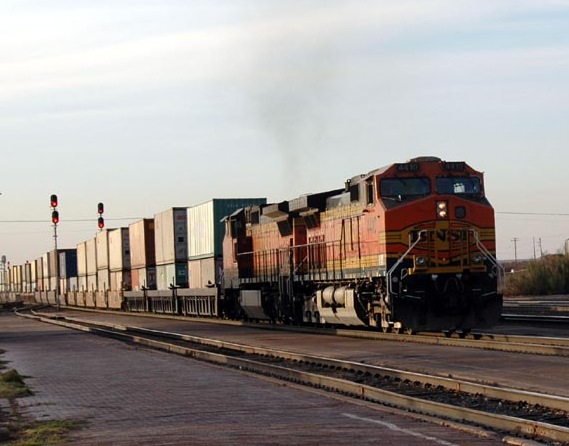 Left: Jay, Jane, Will, and Roger wait for the train in the early morning cold at the train station whose design matches Colter's hotel. Left: One of the half dozen freights, all of them carrying shipping containers or trailers, that came by early this morning.