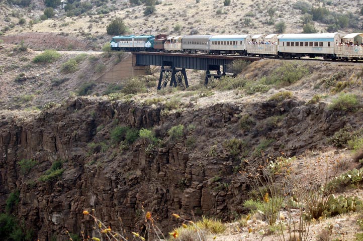 Left: The railroad logo. Middle left: A crew member — the engineer? — boarding the engine, an General Motors Electromotive Division FP7, originally owned by the Alaska Railroad. Middle right: The locomotive bears this eagle because, as the railroad brochure explains, Verde Canyon is "home of America's symbol, the bald eagle." Right; The first-class car in which we made the trip.