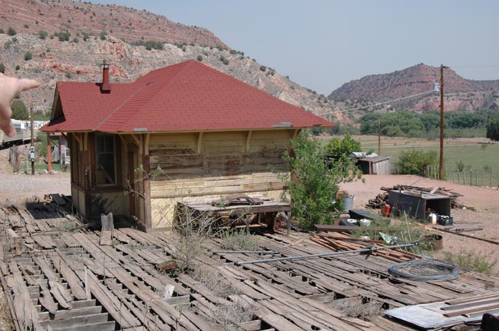 Left: As we reached midpoint in the journey, we arrived at Perkinsville, a deserted town with a partially destroyed watertower and a repair shed. According to Wil, although this stop was named after the Perkins, who owned a nearby farm, the railroad was only extended here to ship limestone needed in the smeltering opperations. Right: the old train station, one typical of small stations in the southwest.