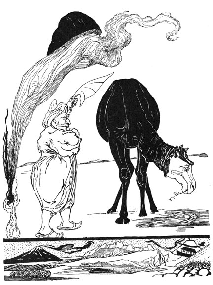 Comentario de Kipling: HERE is the picture of the Djinn in charge of All Deserts guiding the Magic with his magic fan. The Camel is eating a twig of acacia, and he has just finished saying 'humph' once too often (the Djinn told him he would), and so the Humph is coming. The long towelly thing growing out of the thing like an onion is the Magic, and you can see the Humph on its shoulder. The Humph fits on the flat part of the Camel's back. The Camel is too busy looking at his own beautiful self in the pool of water to know what is going to happen to him. Underneath the truly picture is a picture of the World- so-new-and-all. There are two smoky volcanoes in it, some other mountains and some stones and a lake and a black island and a twisty river and a lot of other things, as well as a Noah's Ark. I couldn't draw all the deserts that the Djinn was in charge of, so I only drew one, but it is a most deserty desert. [p. 20]