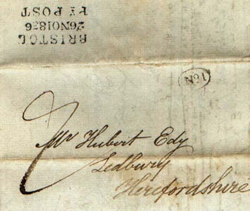 This letter from the past was posted in a Bristol Penny Post Receiving office. It was written by William Miles of Manilla Hall, in Bristol on 26th November 1836, was addressed to Mr Hubert Edy of Ledbury, Herefordshire, and had three postal markings.