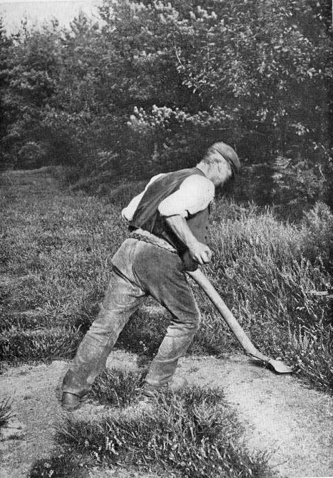 "An interesting local tool is a kind of spade used on the heathy wastes for cutting heath-turf for burning. It is used as shown (on page 203). The man throws the weight of his body against the heavy cross-handle. It looks a cumbersome, lumbering thing, but in actual use its weight helps the work. The cutting of heath-sods for fuel is one of the commoners' privileges." — Old West Surrey, p. 204