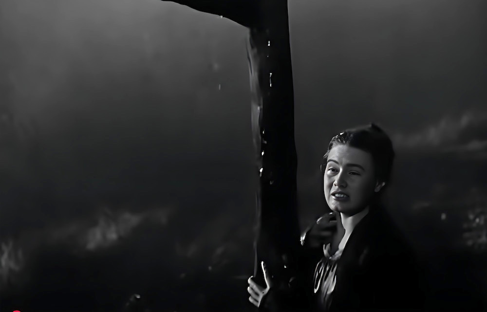 Two shots concerning Oliver’s mother, played by Josephine Stuart, as she struggles through the storm: Left: borne down by wind and rain: Right: the emblematic bramble that suggests her agony, outlined as an abstract form against a tumultuous sky.