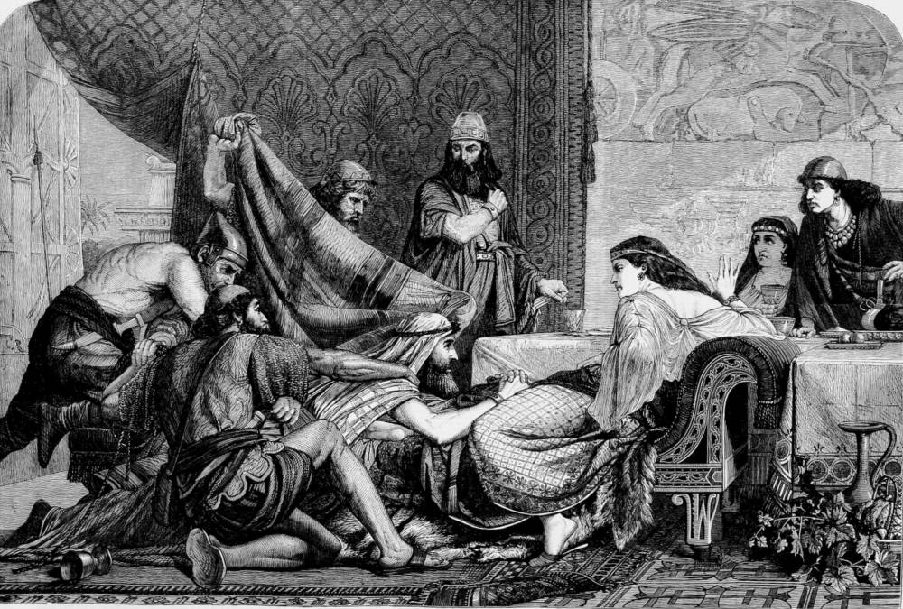 All the accessories of the picture have evidently been most carefully studied from the Scripture narratives, and inferentially from Assyrian remains, to which the general character of the Persian ornamentation would assuredly bear a close resemblance; as, for instance, the “gold bed,” here covered with a tiger-skin, meaning, doubtless, thereby the couches round the tables, like the triclinium on which the Greeks and Romans sat at their meals and symposia; the “pavement of red and blue, and white and black marble,” interesting as, we believe, the first mention of that tessellation of floors, afterwards carried to such elaboration in the pavement mosaics of the Roman houses, temples, and baths; the carpets, for the manufacture of which Persia is celebrated even now; the “green hangings with coids of fine linen;” the Assyrian-like bas-relief of a hunting subject against the wall; and the glimpse through the marble porch of the sultry light on the gardens which were so extensive and famous a portion of the palatial inclosures of the great Eastern monarch.
