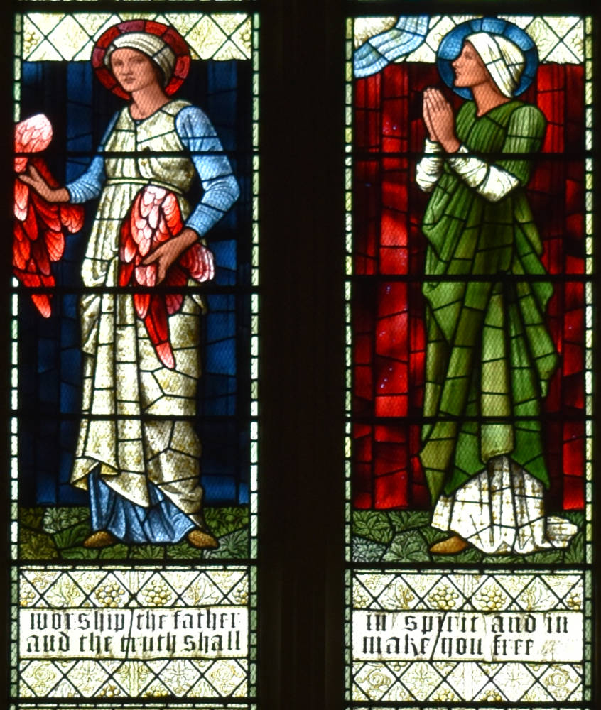West window, Chapel of Harris-Manchester College, Oxford. Designed by Edward Burne-Jones, executed by Morris & Co. he large panels from left to right are an angel, Truth, Liberty, Religion, and another angel. The scenes below depict the Angels telling the Sheperds of Jesus birth, the Nativity, Jesus in Joseph's carpenter shop, Jesus blessing the children, and Mary Magdalen washing Jesus' feet. Smaller angels playing musical instruments are in the top of the window. Click on images to enlarge them.