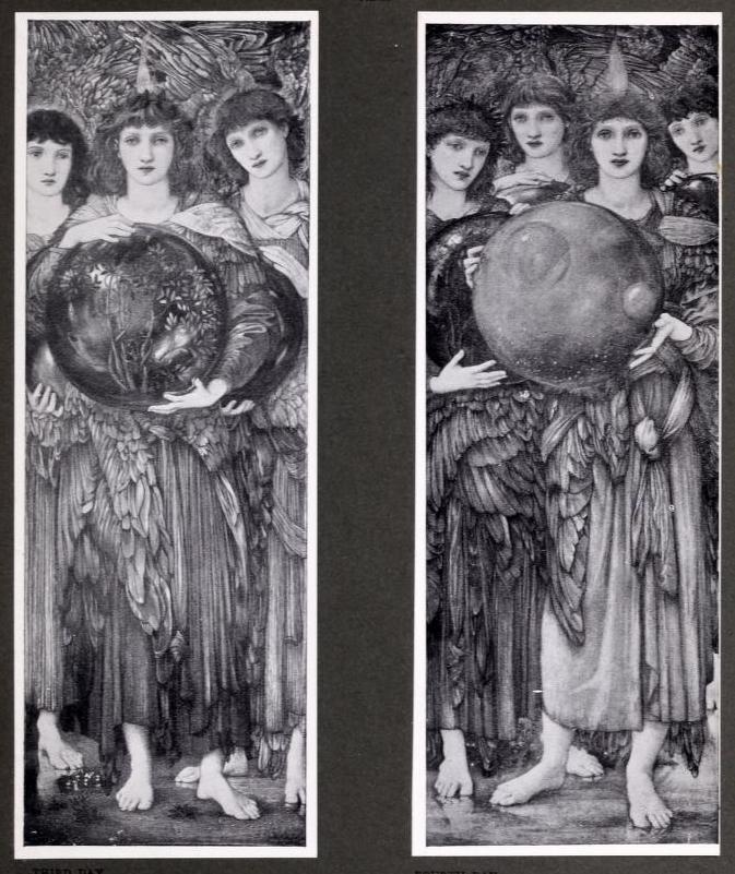 Burne-Jones loved to depict richly feathered ministering or praising angels, in paintings, tapestry or stained glass. These however are the angels who demonstrate to us the story of creation, as told in the first chapter of Genesis. Perhaps it was no coincidence that when he first painted this subject in watercolour, in the early to mid-1870s — having designed it in 1870 and finished it in 1876 (see "The Days of Creation," and his wife's Memorials, 67) — people were still trying to absorb or refute Darwin's theory of evolution.