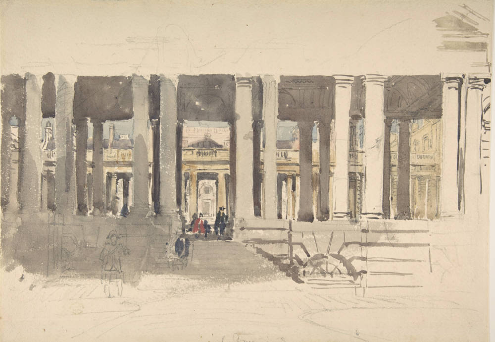 This quick sketch brims with useful information: near the top of the sheet, between the paired columns, touches of blue watercolor (and, elsewhere, the word "blue") indicate the color of the sky; at the upper right, a triangle of brown wash suggests a pediment; in the center, swift strokes of black, red, and blue describe figures dressed in naval uniform. Cox began his career as a theatrical scene painter and rose to become one of the leading watercolor artists of the nineteenth century. He first exhibited views of Greenwich in the early 1820s, but the bold handling of the present sketch suggests a later date.
