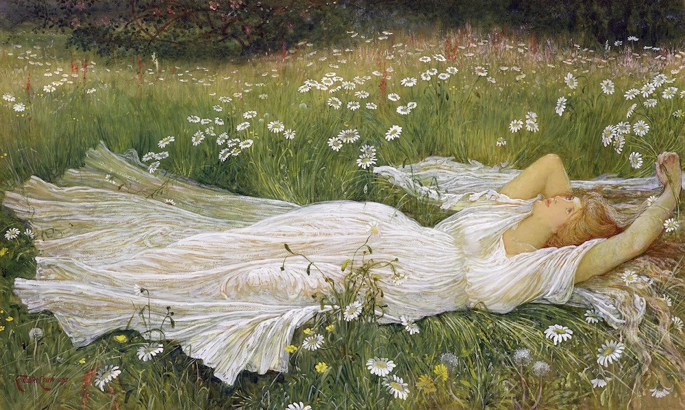 Crane exhibited this work at the Winter Exhibition of the Royal Society of Painters in Water Colours in 1895-96, no. 200. It features a beautiful young maiden clad in a diaphanous white gown lying in a meadow, her right hand tucked under her head. She holds white daisies in her left hand and the meadow is filled with further white daisies and other wild flowers. The white daisies may have been included purely for their decorative effect, but in the Victorian language of flowers white daisies symbolized purity and innocence. A row of bushes fills the background with no glimpse of the sky. When this work sold at Christie's in 2007, one of their specialists, likely John Christian, remarked: "This sensuous and evocative scene conflates two of Crane's most distinctive qualities, the desire to paint figurative subjects on a grand scale and the drive to explore allegorical meaning as a means to convey profound moral truths. Time and again throughout his career Crane returns to the theme of the seasons. They date from all periods of his career, and most are concerned with the joy that a new season, most often Spring, brings" (107). In this watercolour, however, Crane has chosen to feature summer in one of his most beautiful Pre-Raphaelite-inspired works where the continued influence of Edward Burne-Jones is clearly seen. The picture is also reminiscent of the reclining woman in white in J.W. Waterhouse's first version of Ophelia of 1889, or John Byam Shaw's painting Silent Noon of 1894.
