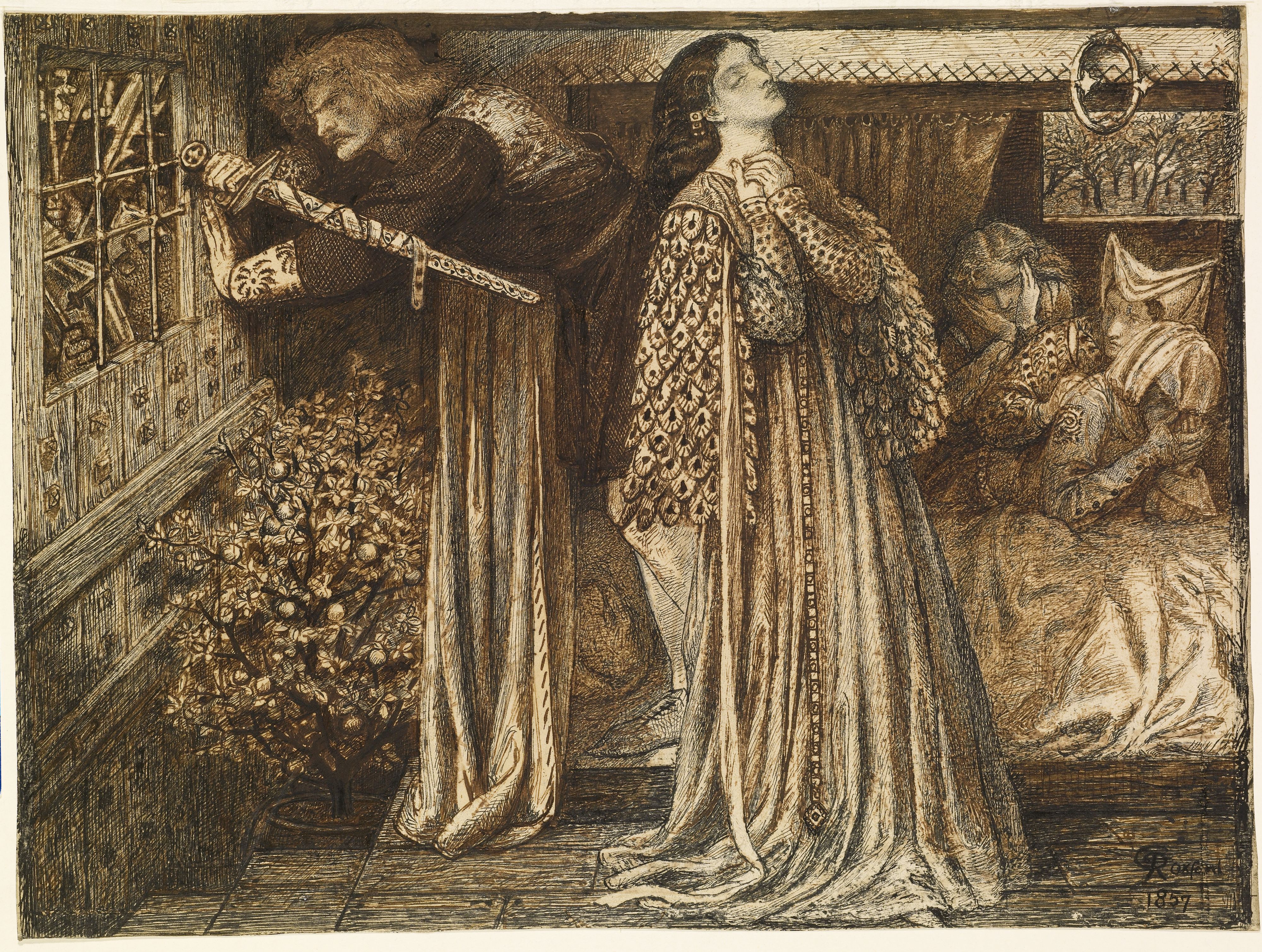 Sir Launcelot in the Queen's Chamber, by Dante Gabriel Rossetti (1828–1882). c. 1857. According to the "Scholarly Commentary" in the Rossetti Archive, "This magnificent drawing may have been completed at the time of the Oxford murals project in the summer of 1857, perhaps intended for a subject for one of the murals DGR planned.... The original frame, now lost, was inscribed with the following text from Malory's Morte d'Arthur (Book XX): “How Sir Laucelot was espied in the Queen's Chamber, and how Sir Agravaine and Sir Mordred came with twelve knights to slay him.” Photograph by Birmingham Museums Trust, identified as being in the Public Domain. — Jacqueline Banerjee.