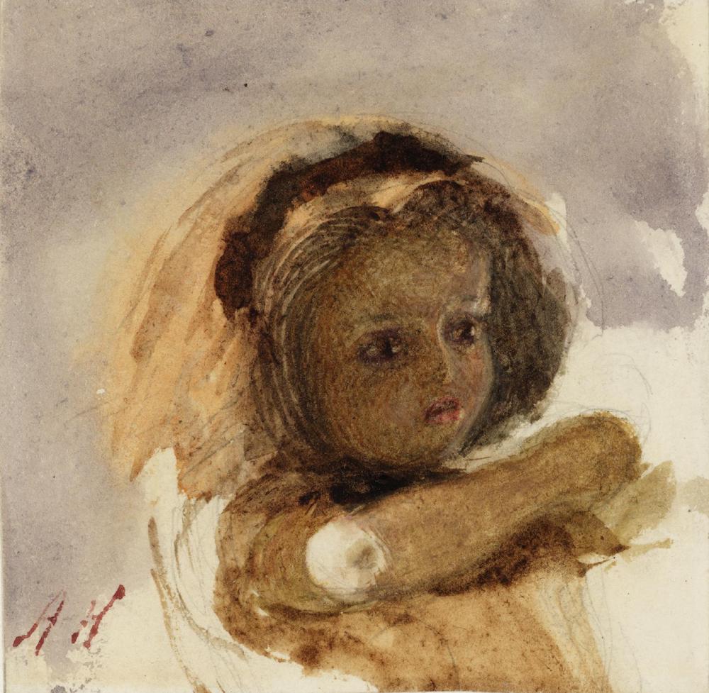 Head of a Child, by Arthur Boyd Houghton (1836-1875). Watercolour on paper. Support: 73 x 73 mm. Collection: Tate Gallery. Presented by Miss Frances Burlison through the Art Fund 1928. Reference: N04397. Image kindly released by the gallery under the Creative Commons CC-BY-NC-ND (3.0 Unported) license. this is one of several studies of children, some graphite on paper, showing Houghton's interest in children, whether his own or others, maybe just to capture gestures, maybe for use in illustrations. — Jacqueline Banerjee.