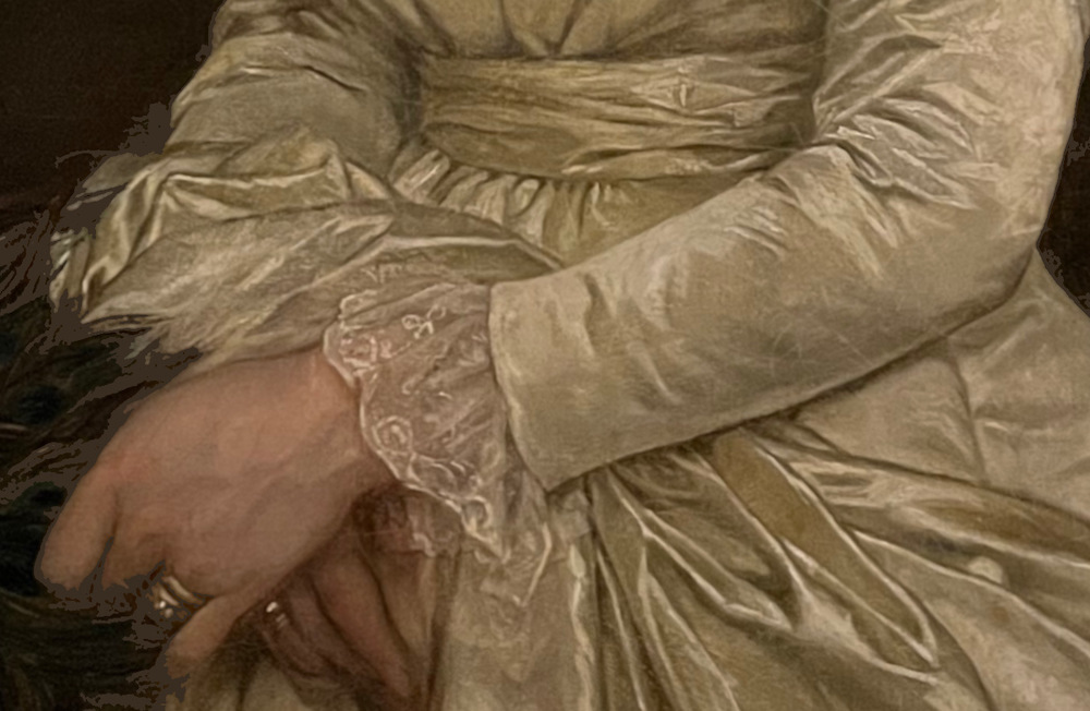 Two details from the painting. Left: Ada Herapath's face. Right: The masterly detailing of her sleeve, cuff and hands (complete with rings).