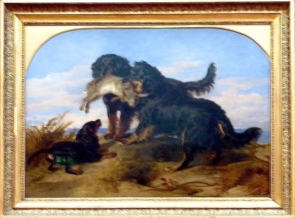 Retrievers with a Hare. Sir Edwin Landseer, R.A. c.1870. Oil on canvas. 122 cm (48.03 in.) x 160 cm (62.99 in.). The painting is in the collection of the McManus: Dundee's Art Gallery and Museum, Scotland, Museum no. 7-1980. [Click on the image to enlarge it.]