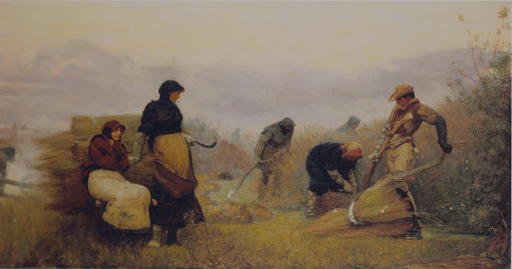 This was the third picture of a trio of paintings Macbeth did commenting on rural labour and "the unpalatable consequences of rapid industrialization and unplanned urban grown, and the economic displacement of rural labour with the breakdown of traditional societal structures" (Esposito, The Idyllists, 140). Macbeth was particularly concerned about the exploitation of child labour. The first painting, A Lincolnshire Gang, was exhibited at the Royal Academy in 1876, while the second was Potato Harvest in the Fens exhibited in 1877. Sedge Cutting in Wicken Fen, Cambridgeshire was shown at the Royal Academy in 1878, no. 1016, and was accompanied in the exhibition catalogue by these lines: "Sedge cutting is one of the remnants of a Fen industry, and Wicken Fen the only remaining portion of a great fen district in which the sedge has free growth. This fen is now reduced to a small acreage by man and his agricultural improvements." In the late 19th century Wicken Fen was home to a thriving sedge-harvesting community, members of which Macbeth has portrayed in this painting. Sedge was cut and used for thatching material as well as for fuel and kindling. Patches of sedge were harvested every three to four years in a patchwork of field strips. A variety of plant and wildlife species thrived in this environment. In Macbeth's painting men and women can be seen cutting, binding, and stacking the sedge they have harvested on a cart. Two young women huddle against the cold by the cart waiting to load additional stacks of sedge. A young man to their right struggles with the bunch of sedge he has just cut with his scythe. The workers are bundled up against the cold and damp when working in the grey misty environment of early morning.