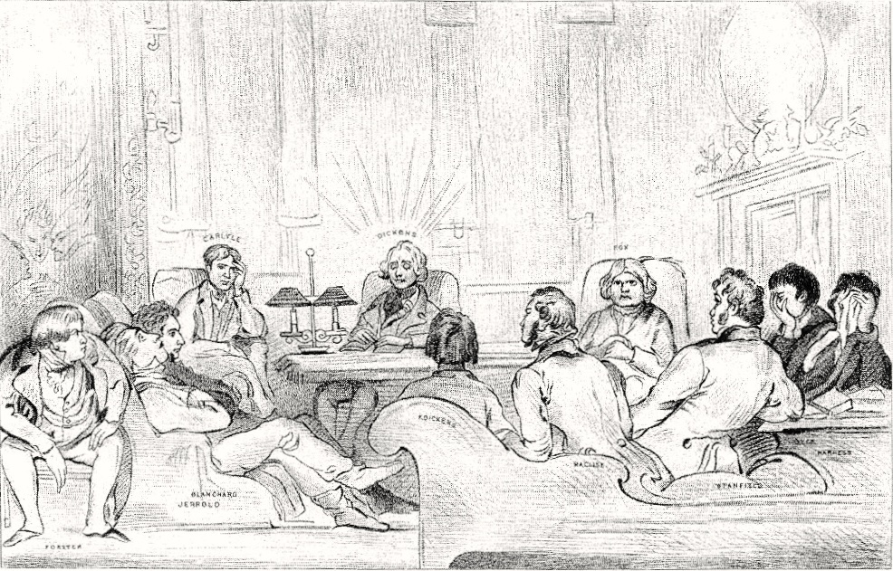 The scene occurred in John Forster's chambers at Lincoln's Inn's Fields, London — left to right, as labelled: John Forster, Douglas Jerrold, Laman Blanchard, Thomas Carlyle, CD, Fred Dickens, W.J. Fox, Clarkson Stanfield, Alexander Dyce, and the Rev. William Harness. [Click on the image to enlarge it.]