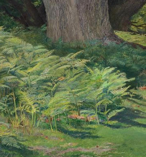 Two details from the painting. Left: The ferns and the lower part of the tree-trunk, showing the texture of the bark. Right: The little girl, possibly added by John Everett Millais.