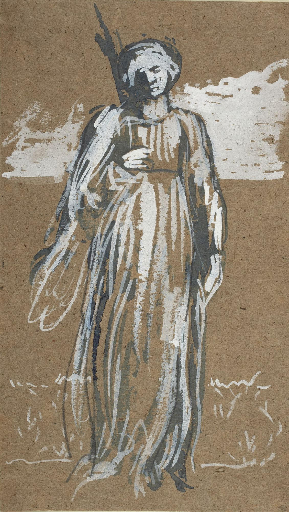 There are a number of studies for The Four Seasons in the collection of the Princeton University Art Museum, including the four studies above, in blue and white wash with pencil on brown paper [object nos. x1948-1452 to 1455]. The figures in the final composition resemble but do not follow exactly the composition of these preliminary drawings. Princeton also owns a pencil drawing for the figure of Summer [object no. x1948-1511]. Murray's oil painting of the left-hand figure for Spring, entitled A Woman in Green Drapery, sold at Christie's, London, on 14 July 2022, lot 42, is shown on the right just below the series at the top of this page. In addition to Spring in The Four Seasons, this painting of an unidentified female subject closely resembles the decorative panels Murray painted for the Green Dining Room at the South Kensington Museum (V&A). This room, decorated in 1866-67, was one of the first major commissions for Morris, Marshall & Faulkner & Co. A Woman in Green Drapery also resembles the decorative panels for painted furniture that Murray did for the firm of Collinson & Lock in the 1870s.