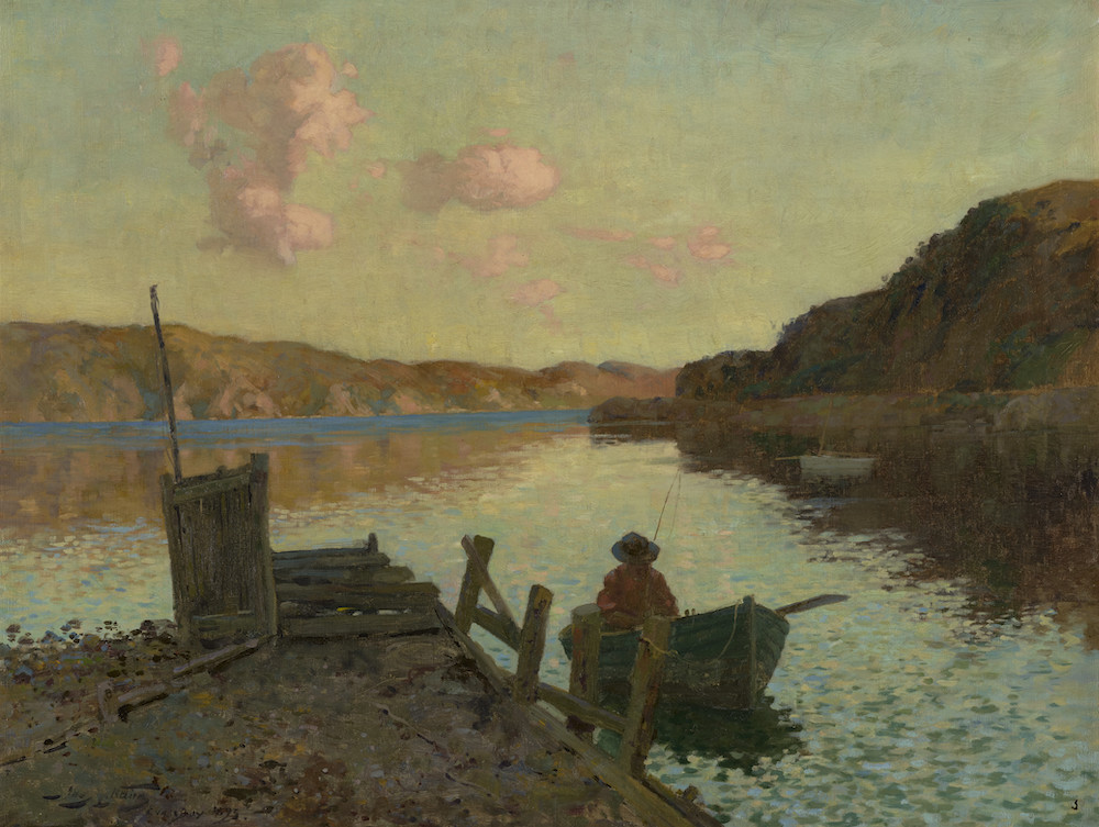 The overview of James Nairn on the Te Papa Museum website tells us, "Nairn painted a large number of impressions of Wellington Harbour, including views such as Evans Bay. These small landscapes show Nairn’s interest in the effects of light, and the influence of Impressionism on his work." In this case, the fisherman is so much in harmony with the peaceful natural scene. — Jacqueline Banerjee